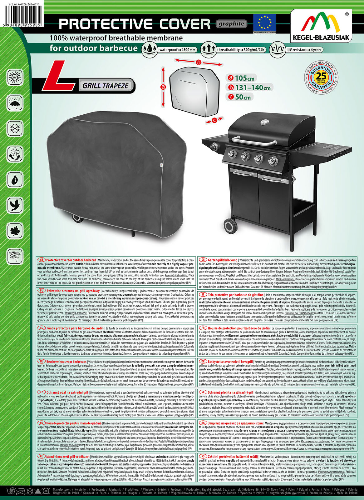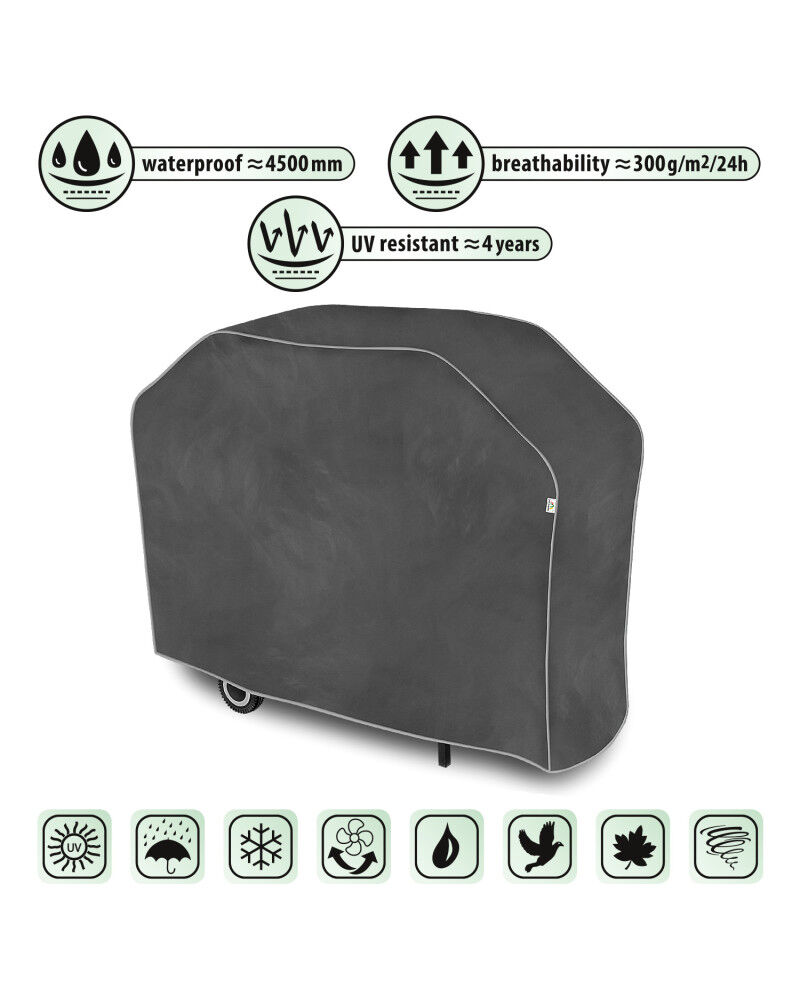 Membranowy, nieprzemakalny i jednocześnie paroprzepuszczalny pokrowiec do ochrony grilla ogrodowego węglowego lub gazowego przechowywanego na zewnątrz przed niekorzystnym wpływem środowiska. Odporny na warunki atmosferyczne pokrowiec wykonany w całości z membrany wysokoparoprzepuszczalnej. Nieprzemakalny nawet podczas intensywnego deszczu i jednocześnie paroprzepuszczalny, odprowadzający na zewnątrz wilgoć spod pokrowca. Ogranicza korozję i starzenie się elementów z tworzyw sztucznych, chroni przed blaknięciem i matowieniem lakieru oraz elementów chromowanych. Odpowiedni także do użytku wewnątrz pomieszczeń. Chroni grill ogrodowy przed deszczem, śniegiem, szronem i promieniami słonecznymi (szkodliwym UV) oraz zanieczyszczeniami jak pył, ptasie odchody i soki z drzew. Łatwy do zakładania i ściągania. Dodatkowe zapięcia zabezpieczają przed zerwaniem pokrowca przez wiatr. Odpowiedni także do użytku wewnątrz pomieszczeń.