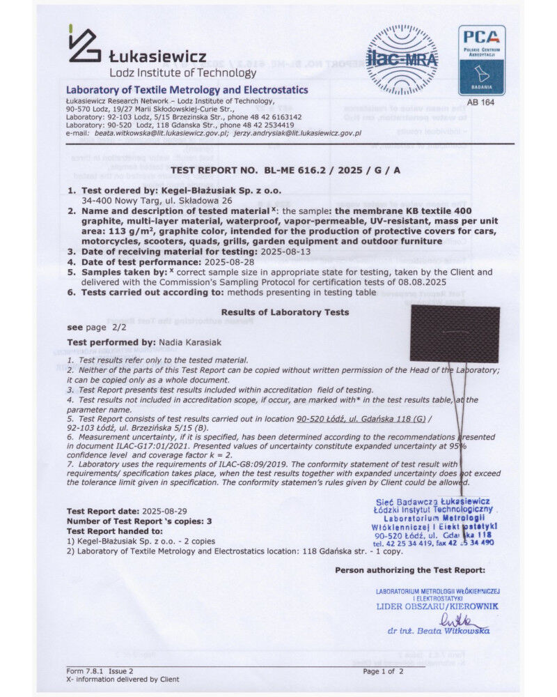 - nieprzemakalny nawet podczas intensywnego deszczu i jednocześnie paroprzepuszczalny, odprowadzający na zewnątrz wilgoć spod pokrowca