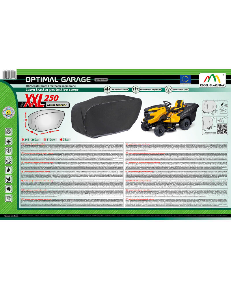 Całoroczny pokrowiec do ochrony spalinowego traktorka ogrodowego przechowywanego na zewnątrz przed niekorzystnym wpływem środowiska. Dzięki specjalnej konstrukcji woda podczas deszczu spływa po pokrowcu nie wnikając pod pokrowiec, a para wodna odprowadzana jest na zewnątrz. Chroni traktorek przed deszczem, śniegiem, szronem i promieniami słonecznymi (szkodliwym UV) oraz zanieczyszczeniami jak pył, ptasie odchody i soki z drzew. Ogranicza korozję i starzenie się elementów z tworzyw sztucznych, chroni przed blaknięciem i matowieniem lakieru oraz elementów chromowanych. Pokrowiec jest w pełni odporny na wszystkie warunki atmosferyczne.